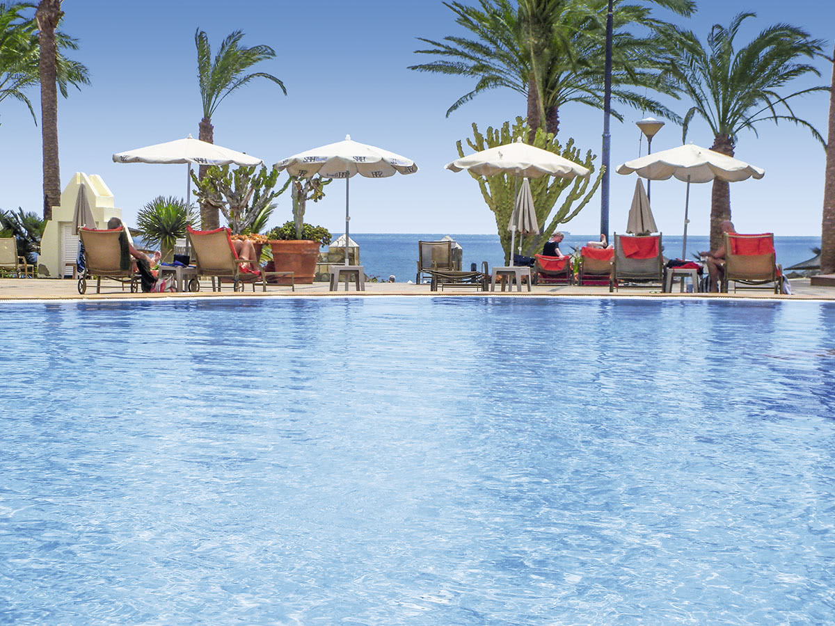 Volledig airconditioned, elegant tophotel midden in een verzorgde tuin die tot het strand doorloopt en met een droomachtig zwembadcomplex met twee zwembaden en geintegreerde jacuzzi. Vanaf de omliggende zonneterrassen met vele rustige plekjes heeft u een prachtig uitzicht op het strand en de zee. Hoge palmen, een pool-/snackbar met zonneterras en uitzicht op zee maken het tot een perfect vakantieparadijs. Ligbedden en parasols zijn inclusief, handdoeken tegen borg en wissel tegen betaling. Imposante lobby met receptie, lobbybar met panoramisch uitzicht, internethoek en WiFi (tegen betaling), restaurant met terras, bars, boetiek en winkels. Spaanse categorie: 4 sterren, 370 kamers, 8 etages, panoramaliften.
